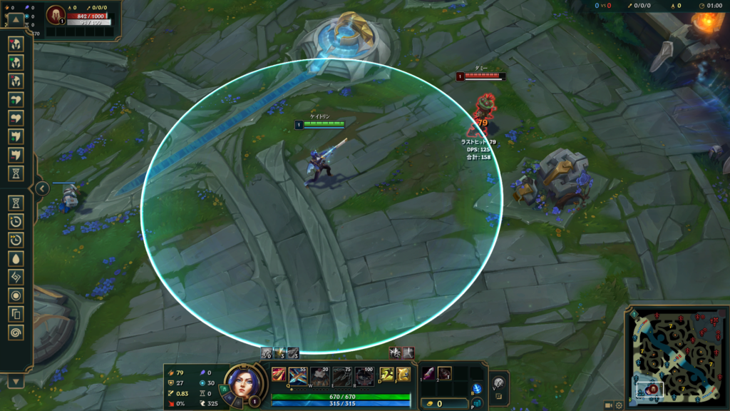 射程はAAが届く距離を示す数値で、大きく分けると近距離(メレー:約125)と遠距離(レンジ:500以上)に分けられます。射程が長いほど安全な位置から攻撃できるため、レーン戦での優位性に直結します。射程が長いキャラとしては例えばケイトリン(通常射程650)などが挙げられます。