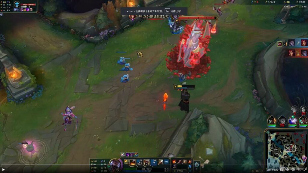 • 青後衛ミニオンの真ん中…最初フォーカスしていたミニオンを倒した後、なぜか手前の2体を無視して後衛ミニオンをターゲット