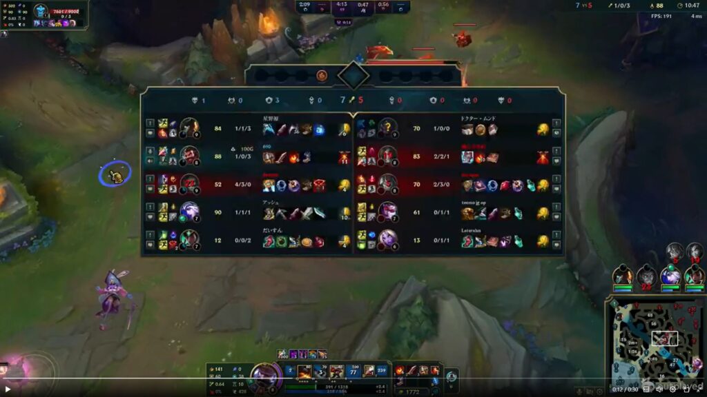というツイートにもあるように、チームゴールド間に差が出ない程度のトレードオフであれば、時には自分が楽しむことを優先することがあってもいいとは思います。このグレイブスのプッシュがトロール、利敵行為として通報されるほどのことはないでしょう。