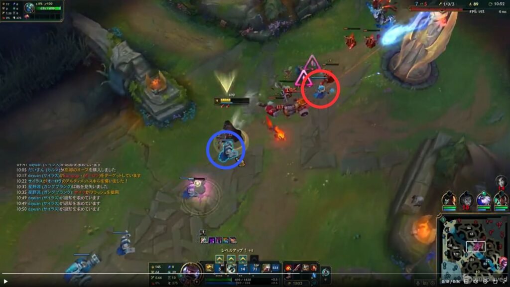この動画は、「MIDの少数戦後(対面のMIDオーロラをキル、JGザイラをミリにして追い返した後)に、サイラスがタワーダイブでザイラをキル。サイラスがデスしたのでタワープレートを獲得したついでに1キャノンウェーブをプッシュした」という動画内容。