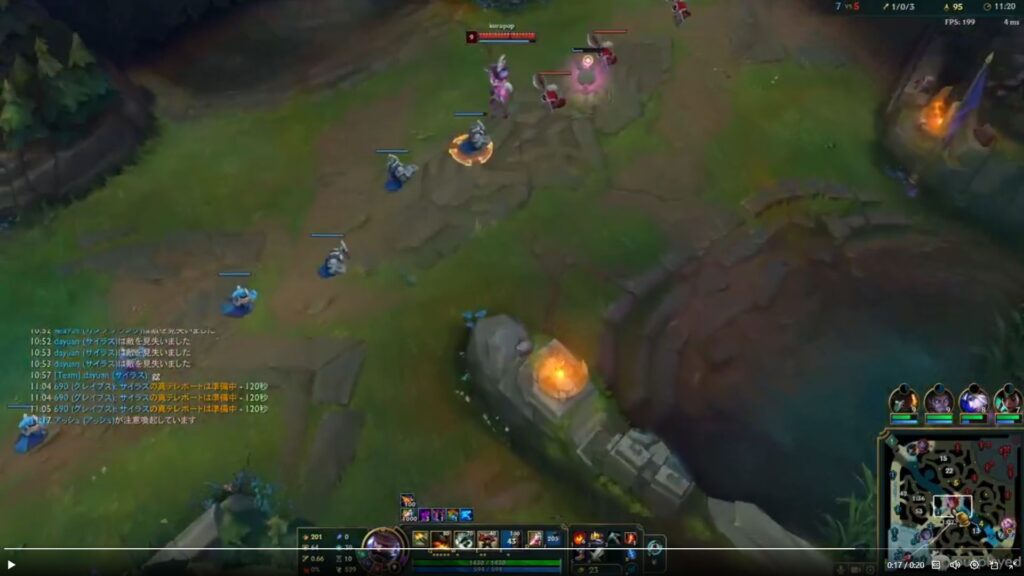 また、時間的にキャノン経験値はお互い落とし、キャノンの次ウェーブはサイラスのレーン復帰が間に合うため、MIDの経験値差はおそらくあまりつかないでしょう。(オーロラが1コア待たなければキャノン経験値は吸えるかも、くらい)