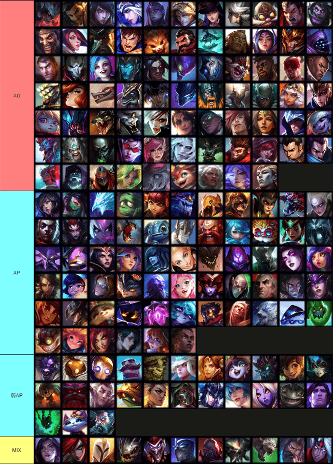 MIXにあるのは、ADビルドにもAPビルドにもいけるチャンピオン。また、シェン・サイオン・スカーナーなどは、ADAPどちらのダメージもプレイング次第で同配分くらい出るので、MIXにしてあります。