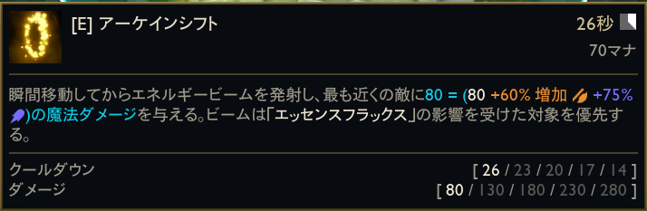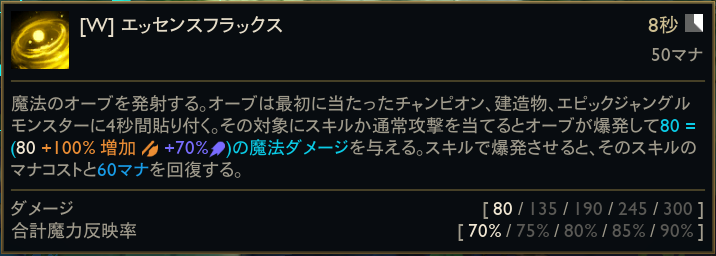 詳細な説明には(20 + 130% + 15%)とあります。これは、基礎ダメージが20あり、AD反映率が130%、AP反映率が15%、という意味です。エズリアル自体がADアイテムを積んでAD値を上げていった際にダメージが上がりやすいスキルということがわかります。